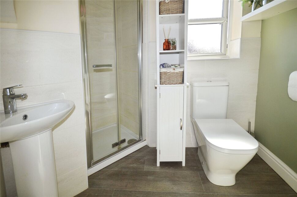 There is a single shower enclosure, pedestal sink and a low flush wc.