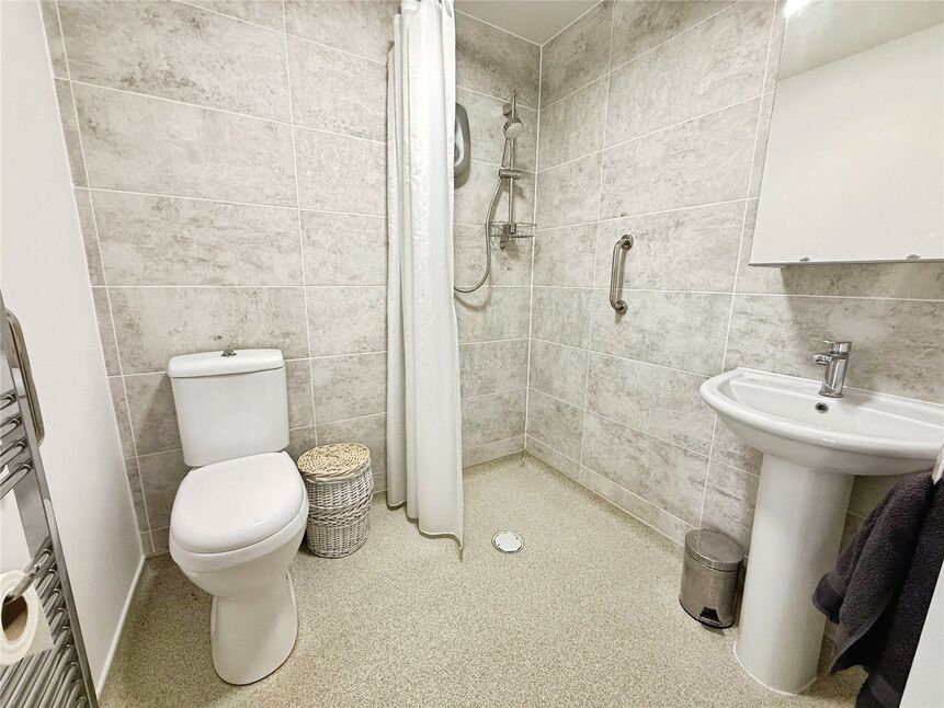 Comprising of shower unit, low level WC, vanity wash hand basin, double glazed frosted window to rear aspect, chrome heated towel rail.