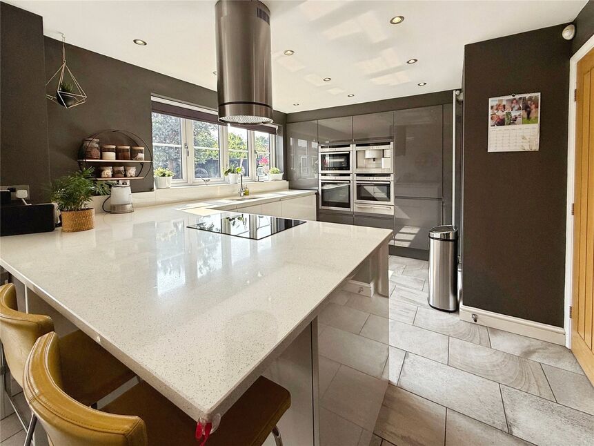 Being fitted with a range of eye level wall and base units with contrasting Quartz work surfaces fitted over which incorporates a breakfast bar, integrated oven, steam oven, coffee machine, microwave & warming drawer. 4 ring induction hob and stainless steel extractor hood over, integrated wine cooler & fridge freezer. Inset one and a half bowl stainless steel sink unit with mixer tap over, double glazed window to rear aspect & bay window to rear aspect, fashion radiator.