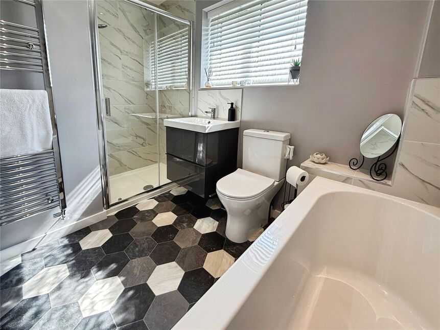 Comprising of panelled bath, shower cubicle, low level WC, vanity wash hand basin, double glazed frosted window to rear aspect, chrome heated towel rail.