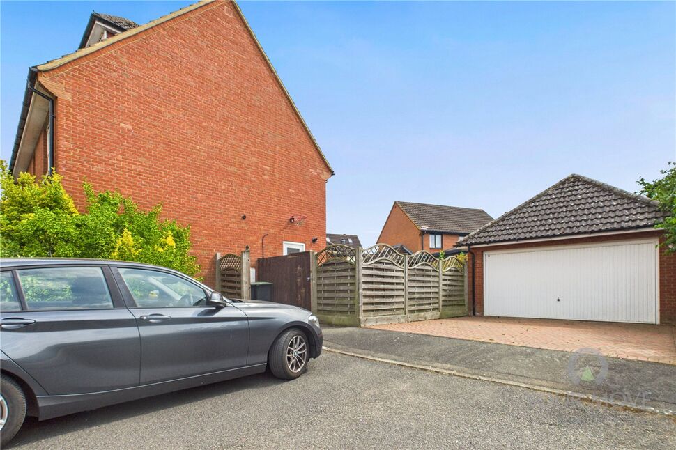 To the front and side, a private driveway provides ample off-road parking, leading to a detached double garage, offering plenty of secure storage or potential for future use as a workshop or gym.