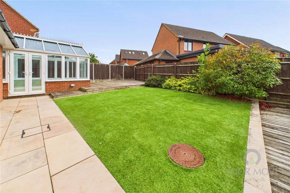 Outside, the private and enclosed rear garden has been landscaped for low-maintenance enjoyment, combining decking, patio and artificial lawn to create distinct spaces for relaxing, entertaining, or letting children play safely.