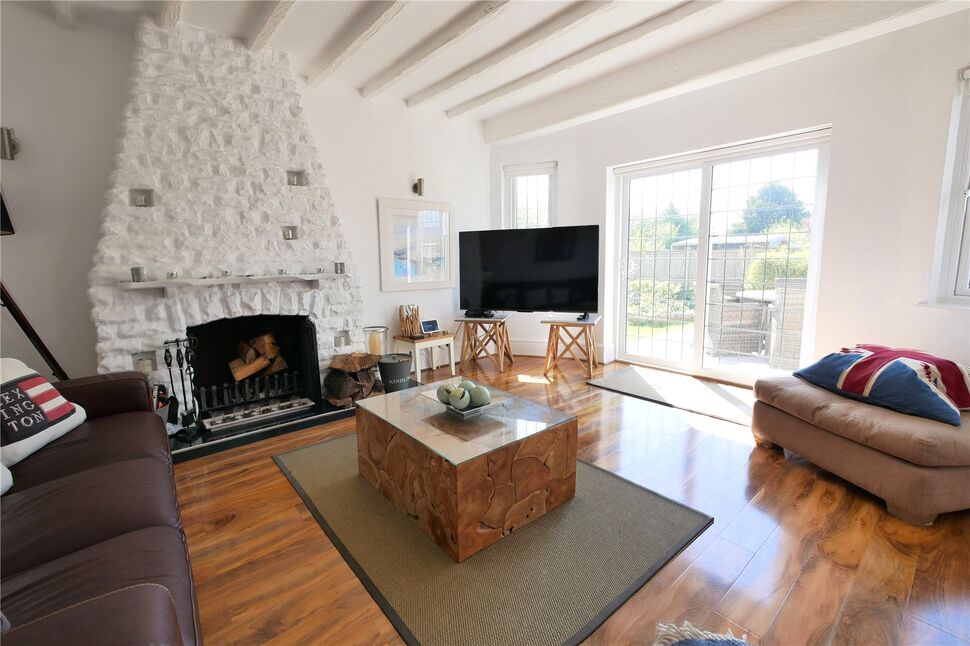 Double doors open into the lounge, which boasts a feature fireplace with a brick surround and TV aerial point. There are five wall lights and two double-glazed windows on the side. Adding to its appeal, sliding doors provide direct access to the garden patio.