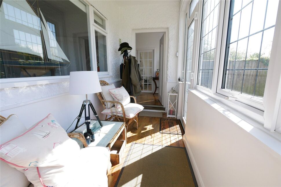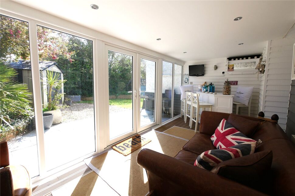 Stepping through the composite door, you'll find yourself in the sunroom. From here, double doors open onto the garden, and it also has entrances to the sauna and the kitchen. The sunroom benefits from recessed lighting and double-glazed windows facing the rear.