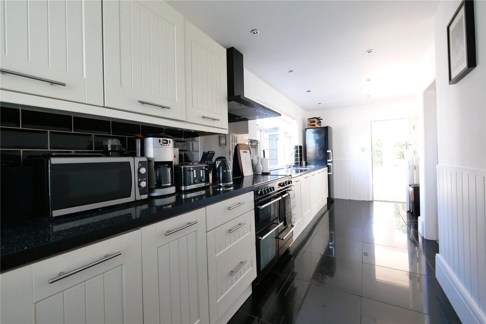 The kitchen is fitted with white wooden wall and base units, beautifully contrasted by black worktops and black tiled splashbacks. A circular single-bowl sink and drainer with stainless steel hot and cold taps are installed. There's a freestanding fridge freezer and 'Leisure' range cooker with an extractor hood above. Double-glazed windows on the side and front elevations. It also includes a radiator and recessed lighting.