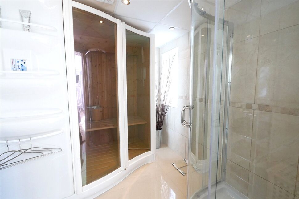This room features a sauna equipped with 'Teco' controls and a corner 'Triton' shower complete with a stainless steel showerhead. Enhancements include tiled flooring and walls, a double-glazed window to the rear and recessed lighting.
