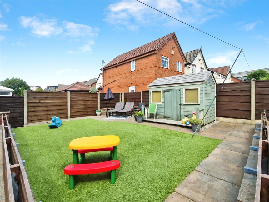 Externally, the property is sat on an impressive plot with a block paved driveway to the front for multiple vehicles and secure double gates leading down the side. At the rear is a superb size, low maintenance garden with patio seating area, raised artificial turf play area and access to the summer house and garage. There is a garage door providing access for vehicles via the alley to the side of the property. Both of these have power and lighting.