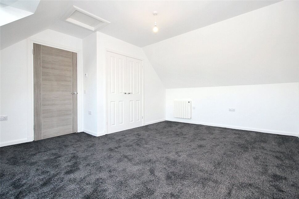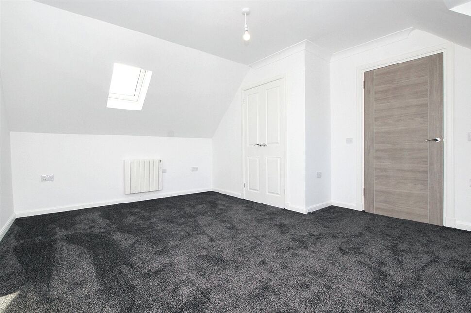 A sizeable main bedroom with two large front facing Velux windows, a smaller rear facing Velux window and built-in wardrobes.
