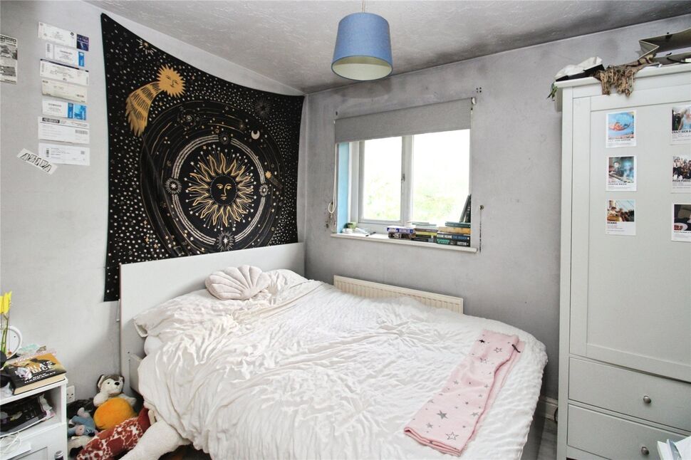 Upstairs, you will find three bedrooms. The first bedroom is a generous double with the luxury of an en-suite shower room. The second bedroom is also a double, providing ample space for furnishings. The third bedroom is a single, offering flexibility as either a bedroom or a study. The house benefits from two bathrooms. The main bathroom features a classic white three-piece suite, while the en-suite attached to the first bedroom offers a convenient shower unit.