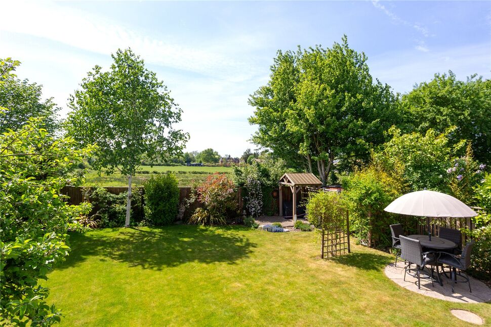The block-paved driveway to the front offers off-street parking for up to three vehicles and leads to the integral garage, which includes an electric roller door and an EV charging point. The beautifully landscaped rear garden is mainly laid to lawn, surrounded by mature trees and well-established borders, and features multiple patio seating areas ideal for entertaining or relaxing. A side garden provides further outdoor space, including a charming summer house with room for a hot tub. The garden’s south-west orientation and open aspect ensure privacy, sunlight, and uninterrupted views over the adjacent countryside.