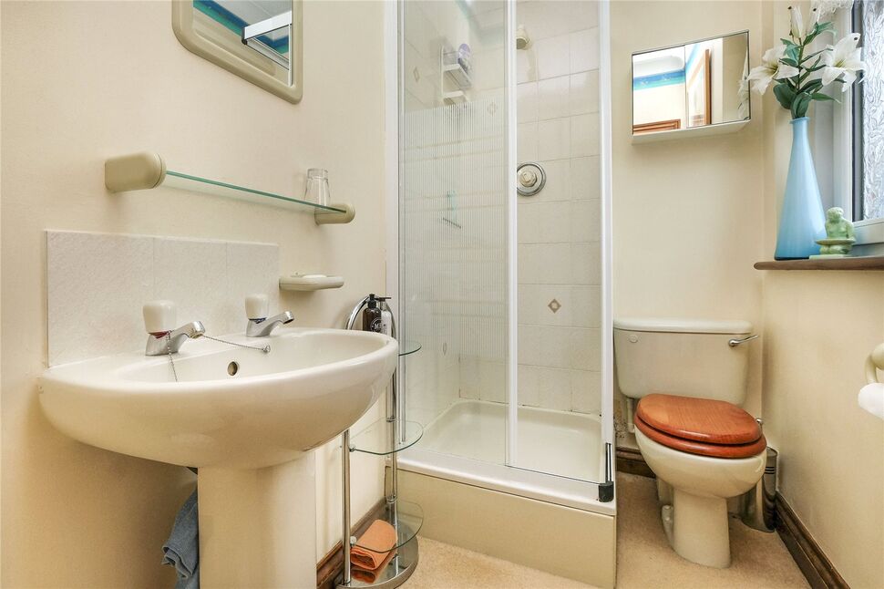 Three piece shower room with corner cubicle, thermostatic shower, tiling, storage cabinet, radiator, sink and WC.