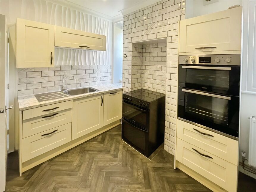 Benefiting from vinyl flooring, this newly refurbished kitchen has been finished with a modern shaker style unit design design with coloured base and wall cupboards, stainless stell sink, electric fan assisted oven and additional space from for fridge freezer.