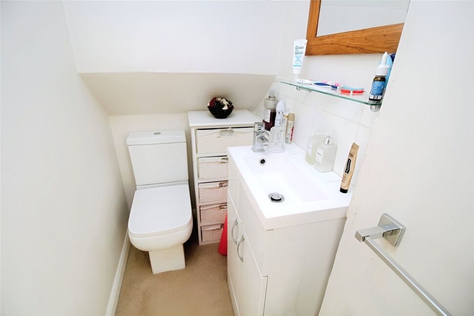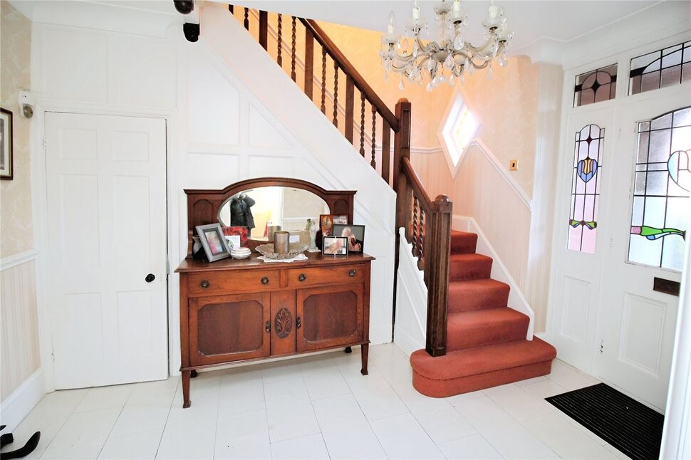 With beautiful period stain glass windows and front door opening through into the hallway. With turning stairs rising to the first floor landing with storage cupboard beneath, a central heating radiator, coving to the ceiling and tiled flooring.