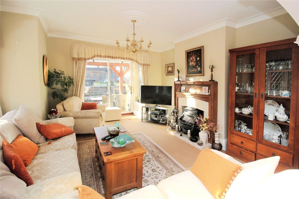 Beautiful, cosy light and airy lounge with double glazed patio doors opening outside, coving to the ceiling, double glazed window and a feature fireplace with wooden surround
