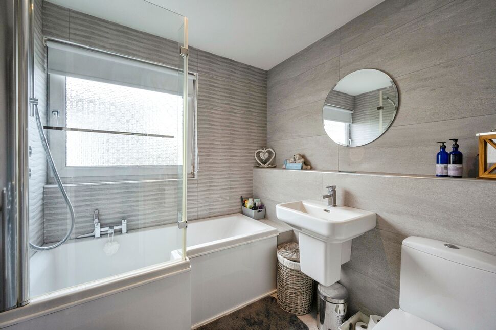 Having side facing double glazed window, three piece modern white suite comprising of panelled bath with shower & screen over, wall mounted hand wash basin and low level Wc. Tiling to walls & floor and a heated towel rail.