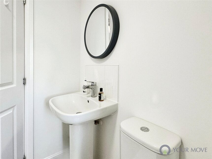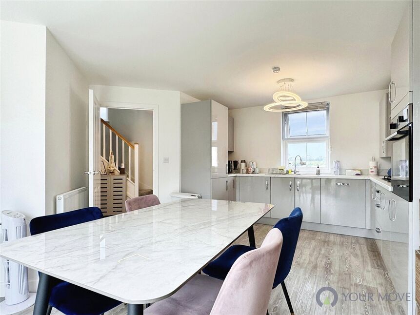 This recently constructed, detached three-bedroom family home, built by David Wilson Homes, is available with no onward chain. The property features a dual aspect living room, an open-plan kitchen and dining area with integrated appliances, a downstairs cloakroom/WC, three spacious bedrooms with an en-suite shower room to the master, a family bathroom, a rear garden, and a driveway.