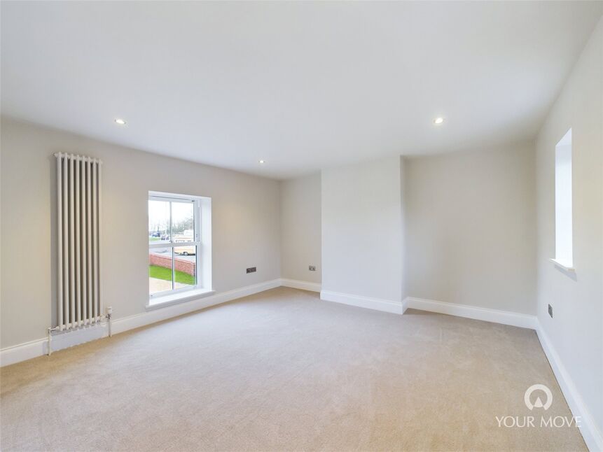 UPVC double glazed sash window to front aspect, traditional style vertical radiator, and spotlight ceiling.