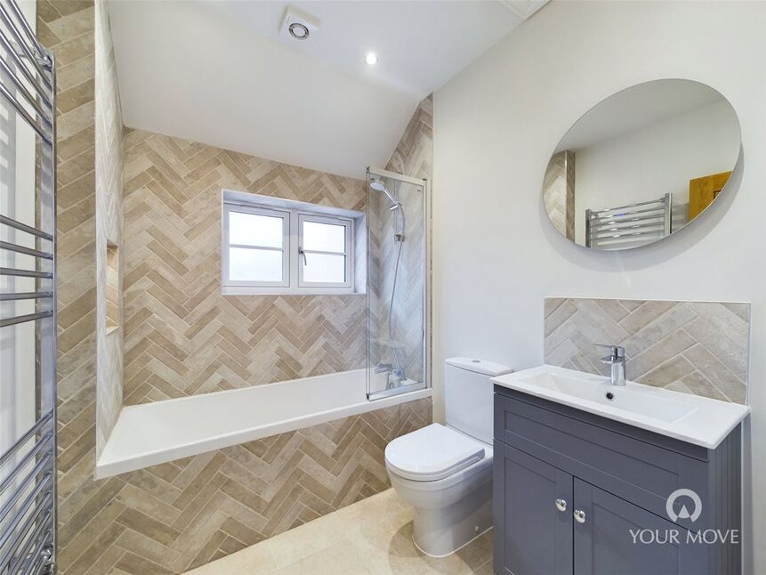 UPVC double glazed window to rear aspect, low level WC, hand wash basin with vanity unit under and tiled splashback, bath with shower head attachment above, partly tiled walls, chrome effect towel radiator, tiled flooring, access to roof space, and spotlight ceiling with extractor fan.