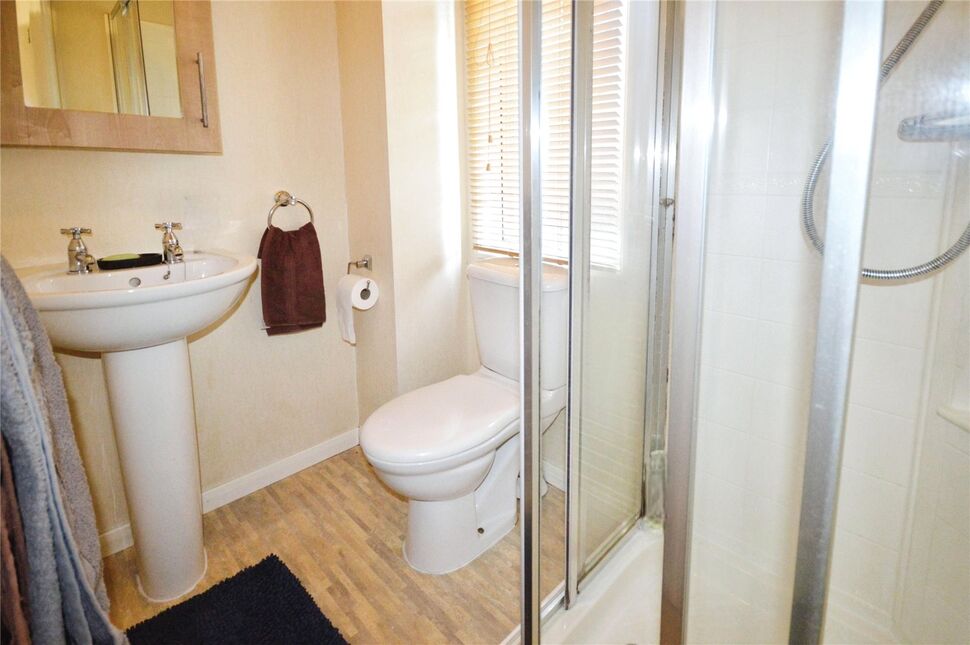 There is a shower enclosure, pedestal sink and a low flush wc.
