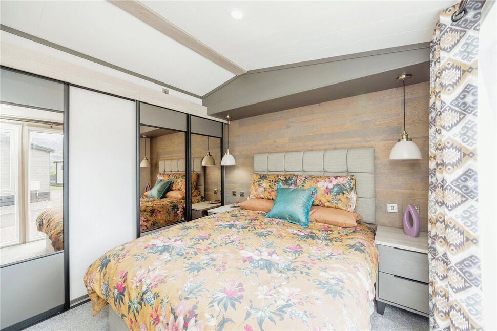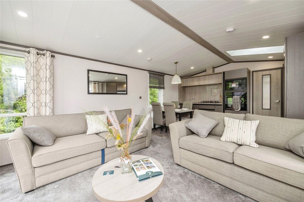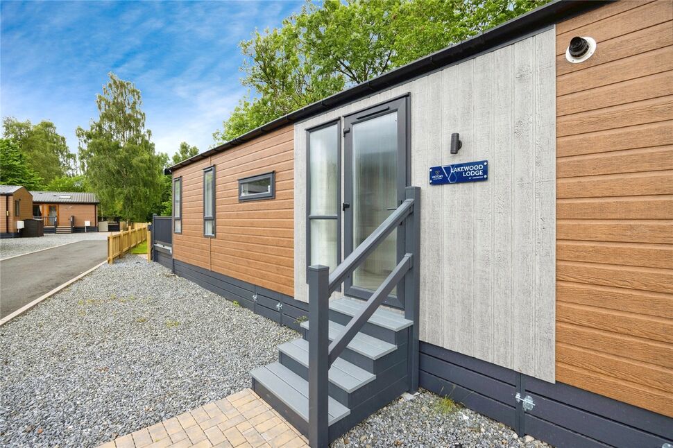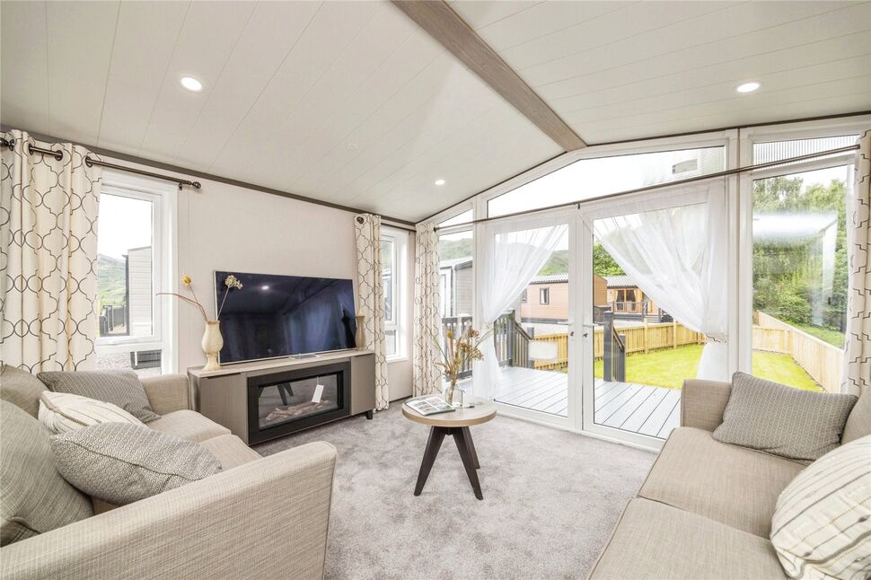 This beautifully appointed lodge is undoubtedly designed to fully benefit from a stunning countryside setting right at the foot of the mountainside in a location of scenic beauty within a tranquil and peaceful environment. Completed to an exacting standard to fully ensure modern living finished with numerous embellishments giving all year comfortable living. Entrance door gives access to the open plan lounge/dining area which is flooded with light with widows to the front and side with French doors leading to directly to the decking area and to the gardens appreciating the tree lined views. An feature fireplace serves as an attractive focal point. The kitchen is beautifully appointed and clever design to incorporate all appliances and adequate size. Appliances include hob, oven, fridge/freezer, dishwasher and washer/dryer. At the rear of the property there are 2 double bedrooms, principal enjoying a an en suite shower room. Both are fitted with wardrobes giving plenty of storage and there is also an additional shower room/wc. Externally there are easily maintained gardens including a large deck to enjoy entertaining or just appreciating the views and a driveway offering parking for a couple of cars.