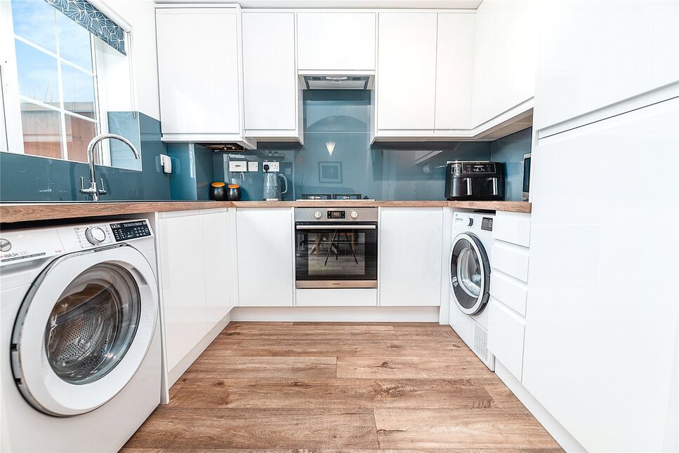 The kitchen is open plan to the dining room and has been recently upgraded and professionally fitted. Made up of a stylish range of white fronted wall, base and drawer units. Contrasting wood effect countertops house the 1.5 bowl sink with side drainer and mixer tap. Integrated appliances include an oven, fridge, freezer, four ring gas hob and an overhead extraction unit. Further to this, there is a rear facing double glazed window, concealed combi boiler, plumbing and point for both a washing machine and dryer and contemporary panelled splashbacks.