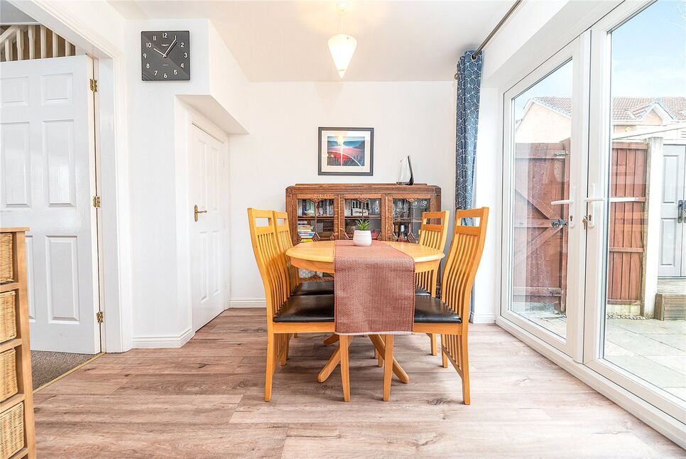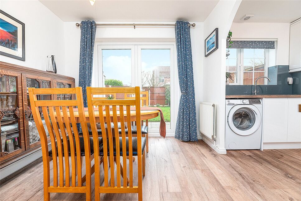 This formal dining room benefits from Moduleo Oak effect floor coverings, a centrally heated radiator, useful under stairs storage cupboard and double-glazed patio doors that open onto the rear garden.
