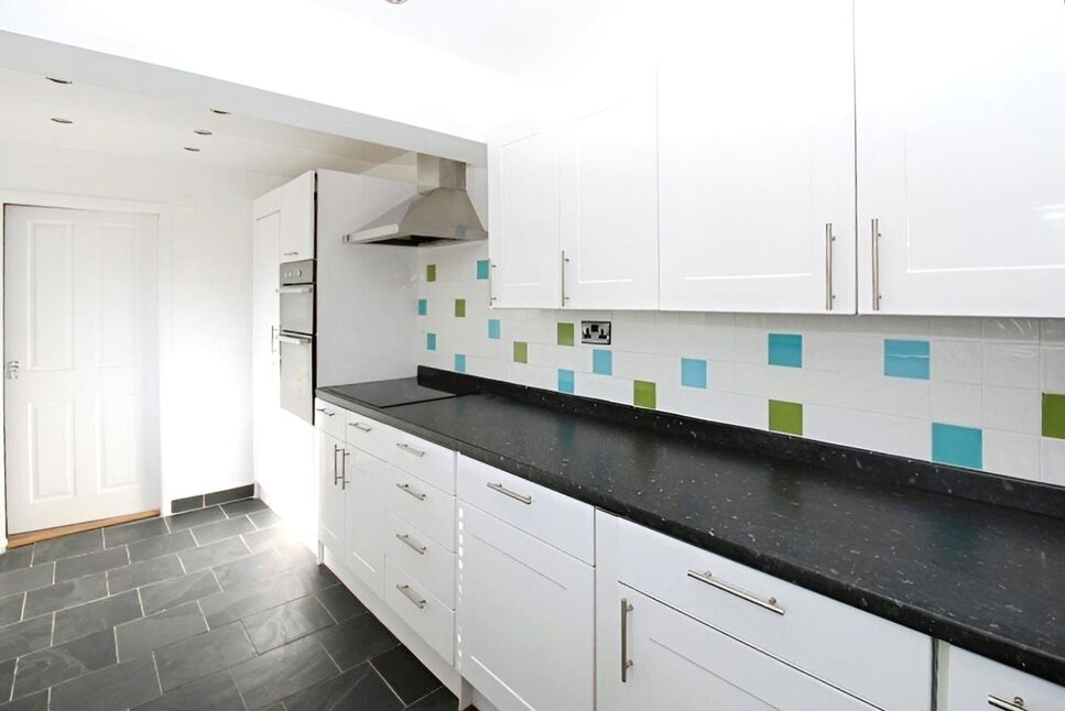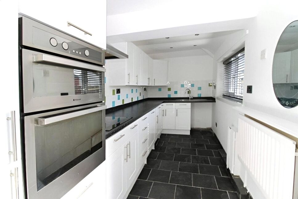 A range of wall and base units with contrasting worktops, eye level double oven, ceramic hob, integrated fridge/freezer and dishwasher, sink, downlighters, space for washing machine, UPVC door leading to rear yard.
