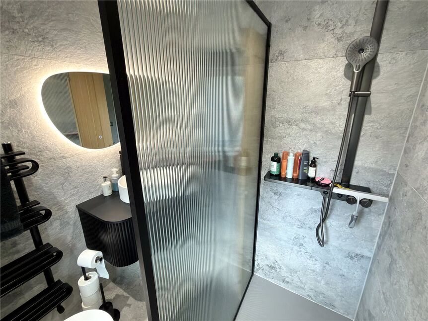 A stylish, recently refitted room with double size shower enclosure, low flush wc, wash basin and vanity unit, heated towel rail and complimentary tiling.