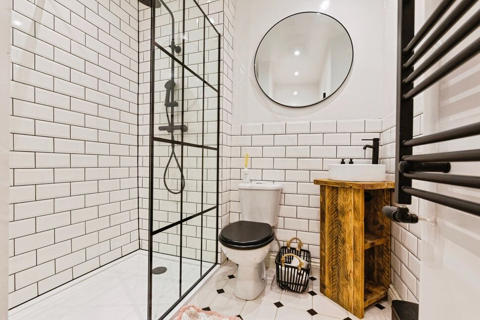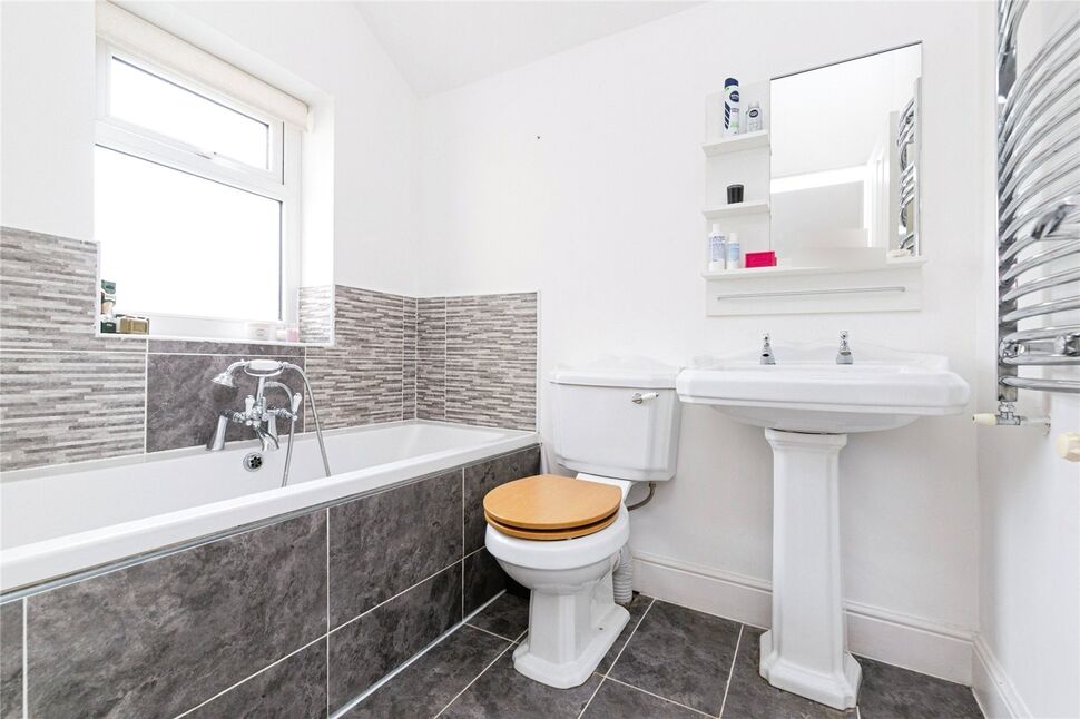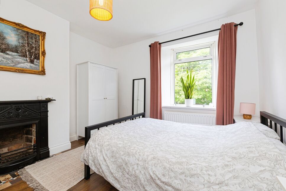 Upstairs, the property offers three well-proportioned bedrooms. The master bedroom enjoys lovely views over the rear and includes a tastefully appointed en-suite bathroom, complete with bath and shower attachment, pedestal wash basin, low-level WC, and chrome heated towel rail. The second bedroom, positioned at the front of the property, features a charming period fireplace and pleasant outlook, while the third bedroom also benefits from front-facing views.