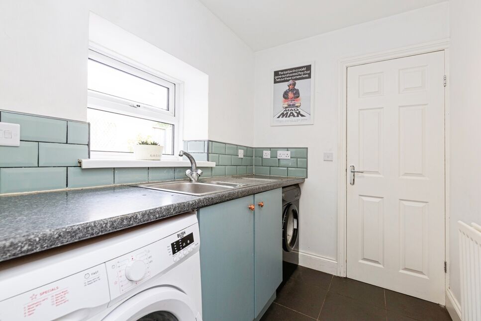 Adjoining the kitchen is a useful utility room, fitted with additional storage units, a stainless steel sink, plumbing for a washing machine, and its own radiator. There is also a stylish downstairs WC with a feature stone wall, completing the ground floor accommodation.