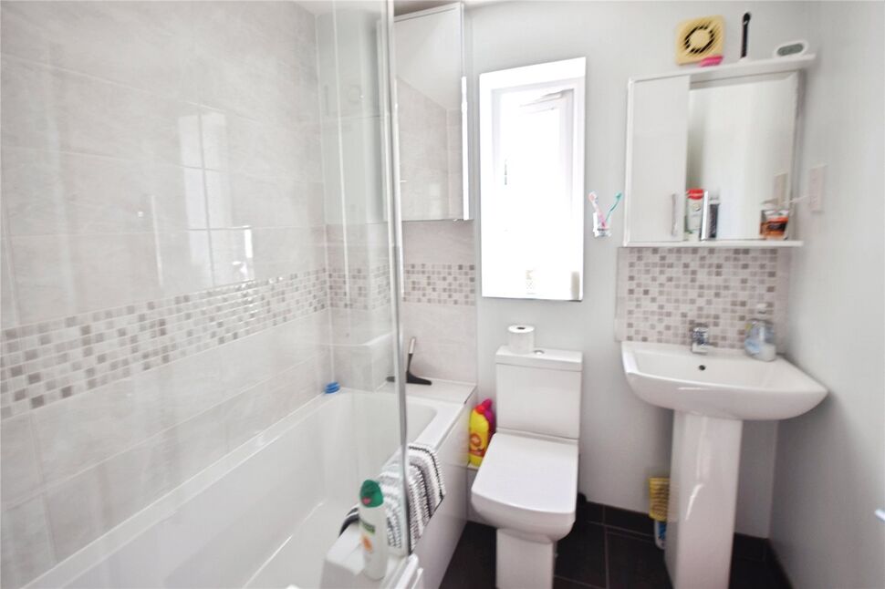 The family bathroom has a crisp white suite, tiled walls, and a shower running over the bath. The enticing outdoors includes a rear garden with feature decking, a good quality artificial grass, a fence surround, and a garden shed. To the front of the house is a driveway, providing ample parking for two cars.