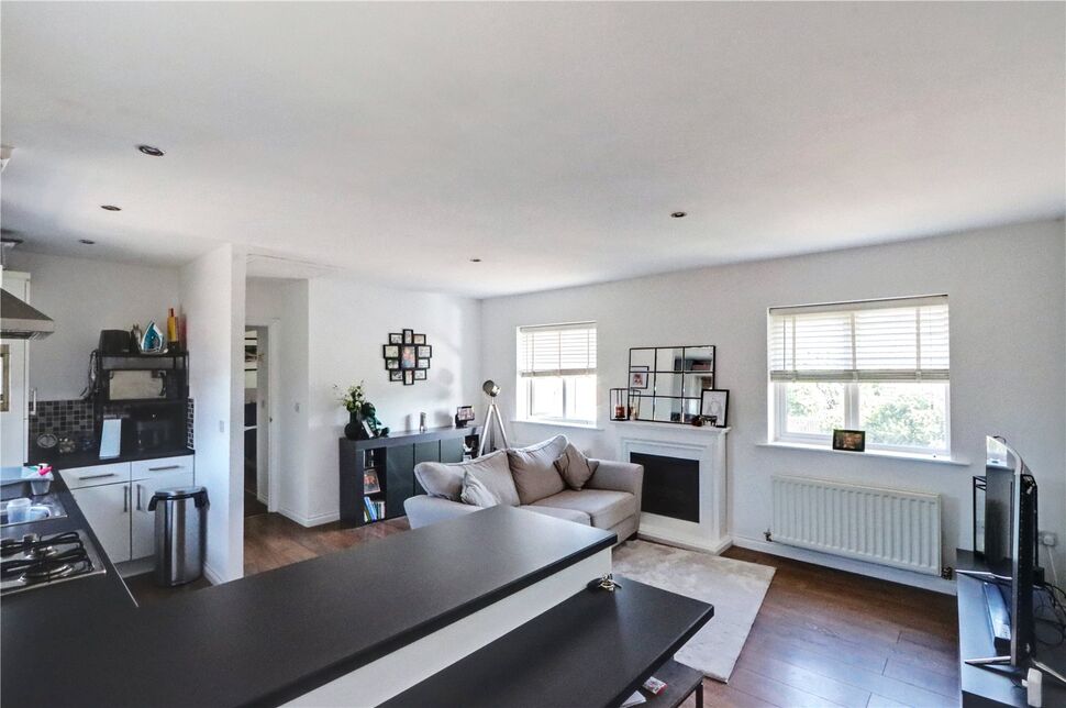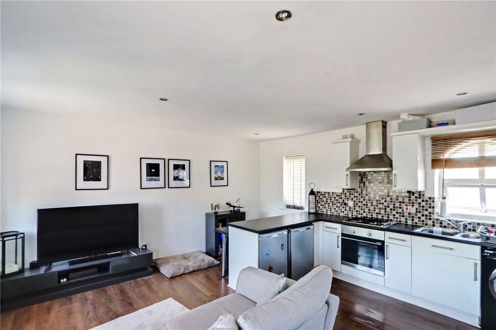 Stairs to the first floor take you into the Open Plan Living space that includes a fitted kitchen with built in appliances. The Bedroom is double in size and served by a modern Bathroom.