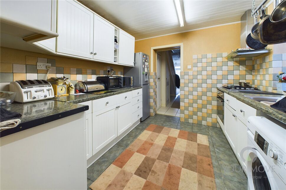 Beyond the kitchen, a rear hallway leads to a convenient pantry/storage cupboard housing the modern boiler, as well as giving entry to the family bathroom and access to the rear garden.