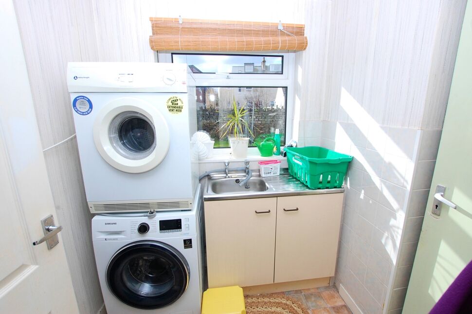 PVCu double glazed window to rear, door to the rear lobby. Base storage unit with single drainer, stainless steel sink unit, plumbing for an automatic washing machine.
