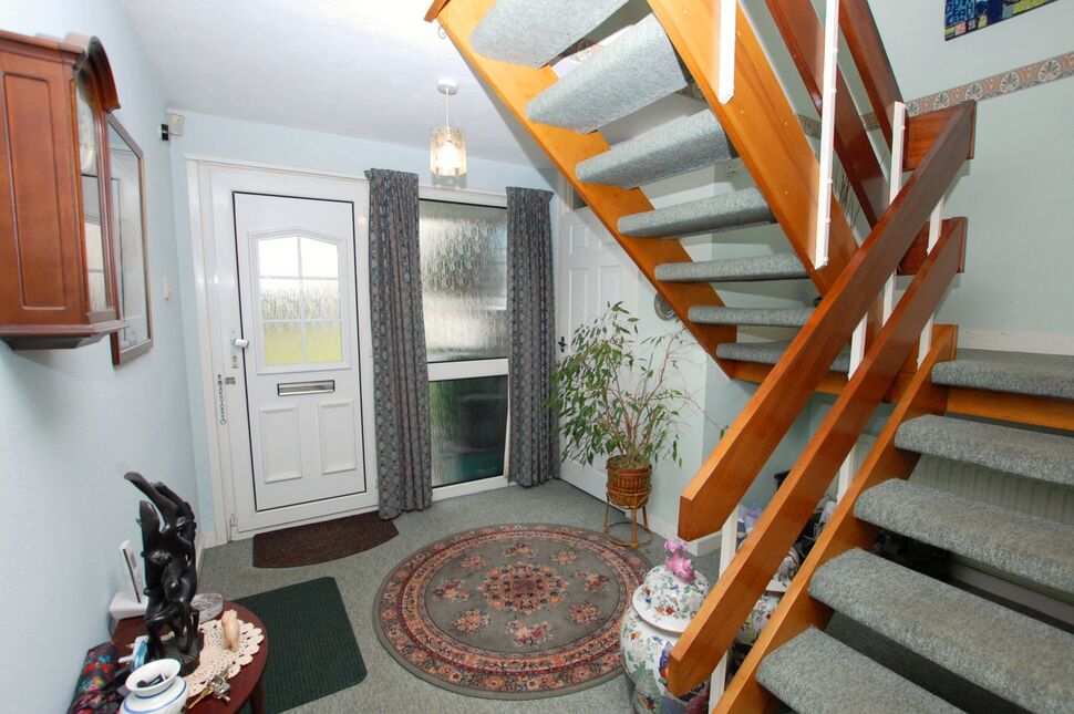 PVCu double glazed entrance door and side panel, open-tread, dog leg stair case rising to the first floor landing, door to the wc, radiator.