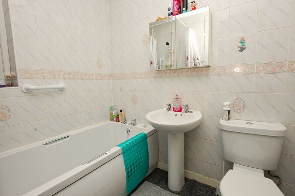 The bathroom is fitted with a white suite comprising close coupled wc, pedestal wash basin and a panelled bath with a Mira over-bath shower, radiator, ceramic tiling.