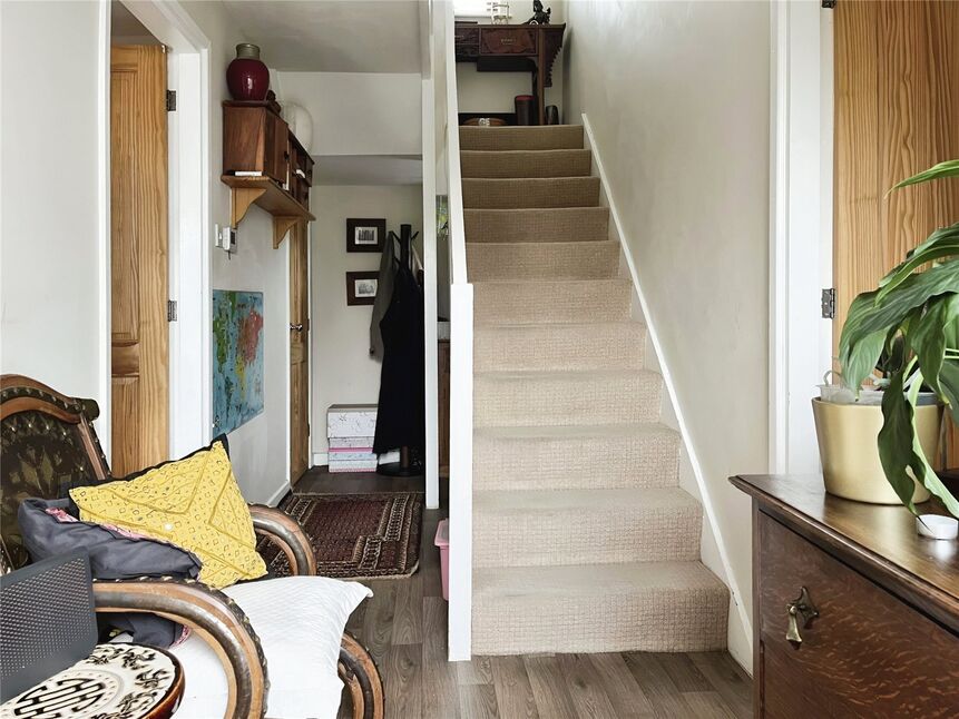 Neutral decor with gas fire, window with wooden style shutters and double glazed door leading out to rear garden.