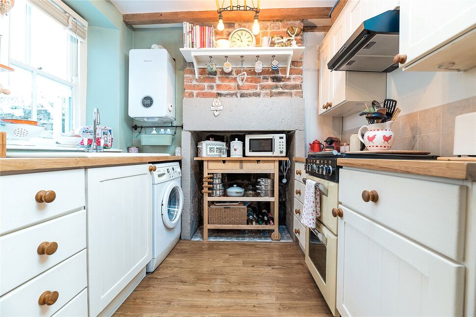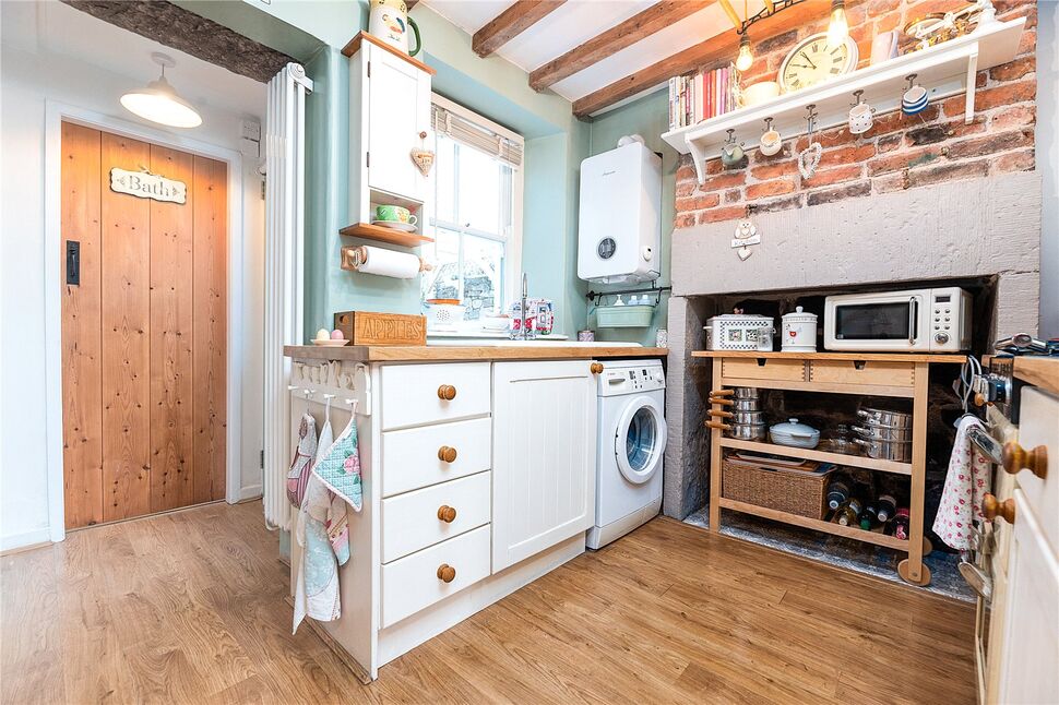 Very well appointed fitted kitchen benefitting from a range of wall, base and drawer units with solid wood work surfaces and inset sink/drainer. Other features to note include a stone fireplace which is currently used as a storage alcove, woof effect flooring, connections for a freestanding cooker, extractor hood, plumbing for a washing machine, tiled splashbacks, exposed beams, radiator, breakfast area, very modern central heating boiler, staircase to the first floor and a sash window to the rear aspect.