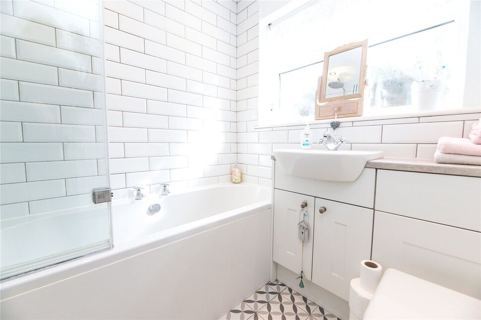 Delightful fitted bathroom featuring a panel bath with shower over, vanity unit wash-hand basin, low flush toilet, tiled flooring, tiled splashbacks, and a double glazed window to the side aspect.