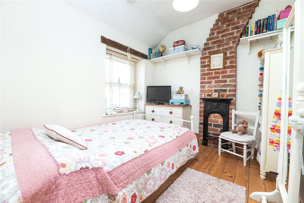 Featuring a feature brick chimney breast, radiator, exposed wooden floorboards, radiator and a sash window to the rear aspect with timber lintel.