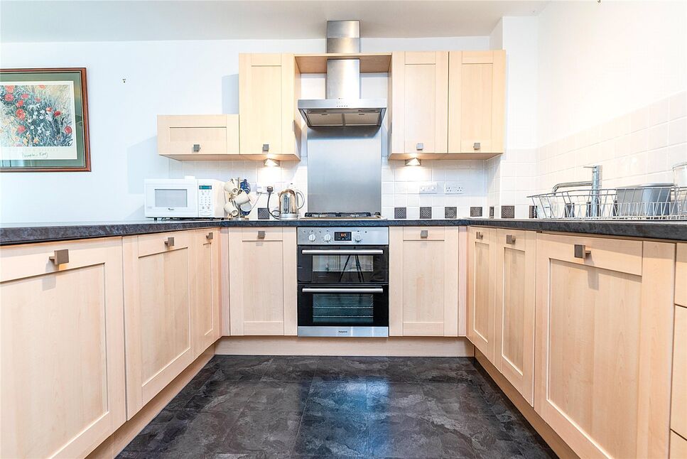 Light and spacious fitted kitchen having a range of wall/base and drawer units, with contrasting worksurfaces and an inset sink and drainer unit. Integrated appliances include a double electric oven with gas hob with extractor hood and a fridge & freezer. Further benefits include tiled splashbacks, radiator, large store cupboard, cupboard housing the boiler with plumbing for a washer, double glazed window to the rear aspect and double glazed French doors to the rear garden.