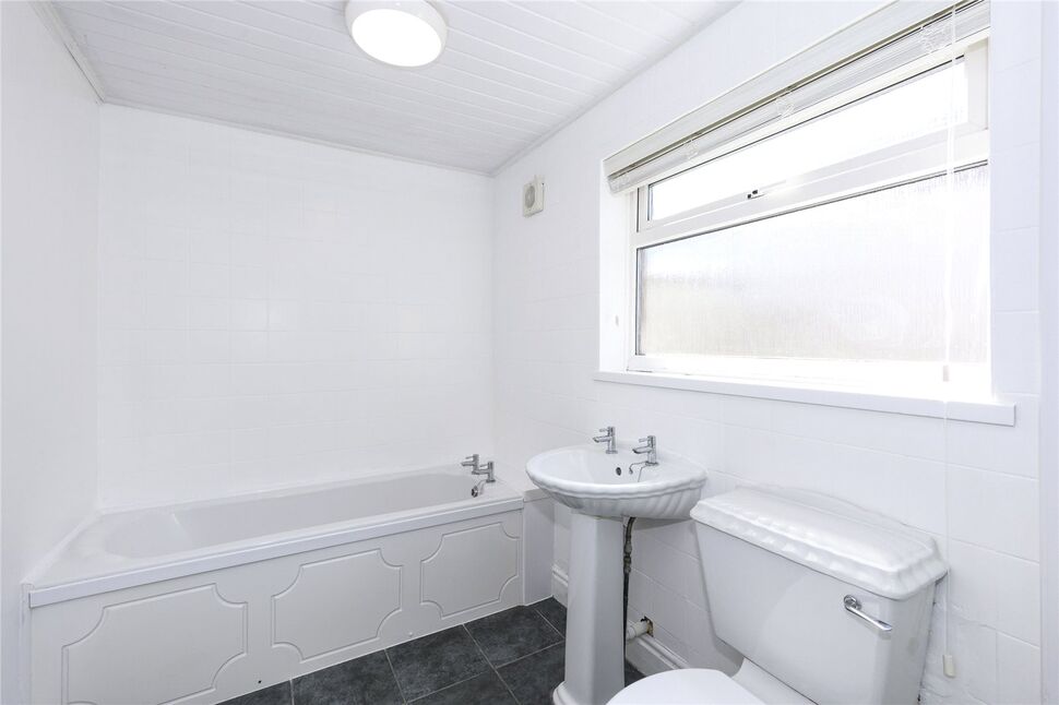 Ground floor bathroom with four piece white suite incorporating bath, separate shower cubicle with thermostatic shower, sink, WC and floor tiles.