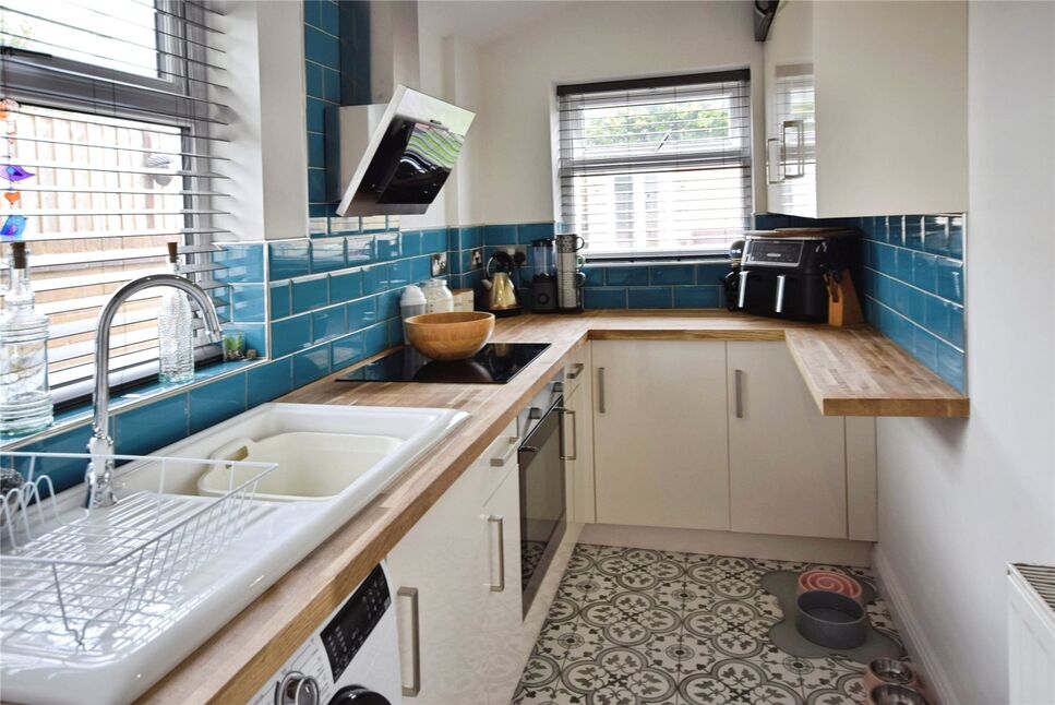 The space has been maximised to create a stunning modern kitchen complete with under floor heating, modern wall & base units with Oak worktops, a ceramic hob, extractor , electric oven, feature tiled flooring & splash backs & a upvc double glazed window to the side & rear elevations.