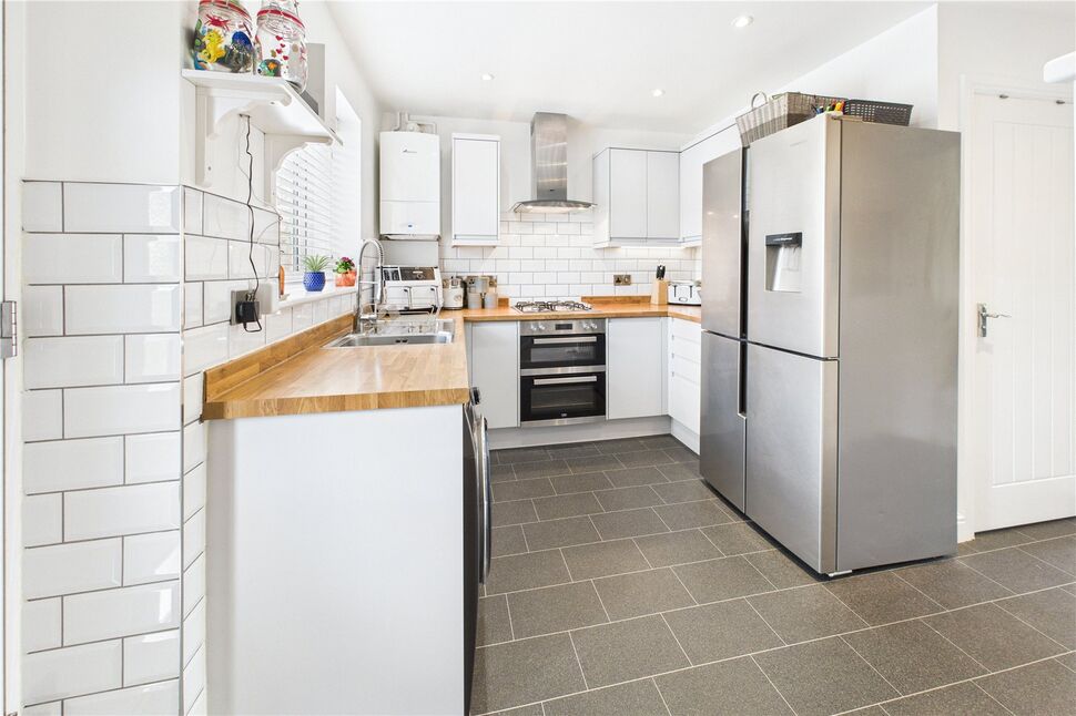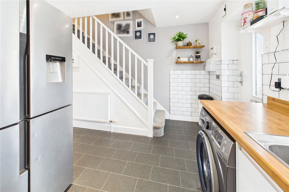 UPVC double glazed window to front, base and wall units, rolled edge worksurface, stainless steel double sink unit, electric double oven, gas hob, stainless steel extractor hood, plumbed for washing machine, stairs to first floor landing, double radiator, understairs cupboard, gas boiler supplying central heating and hot water.