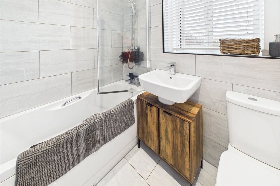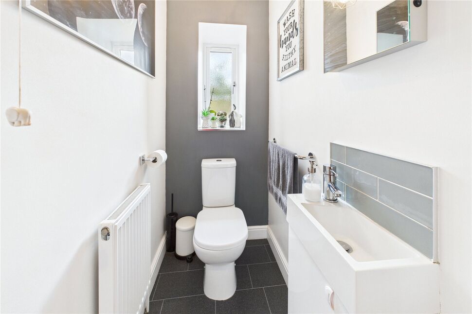 UPVC double glazed window to side, white low level WC, wash hand basin vanity unit below, tiled splashbacks, single radiator.