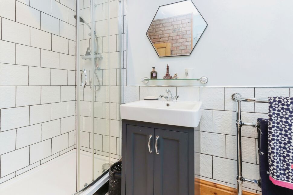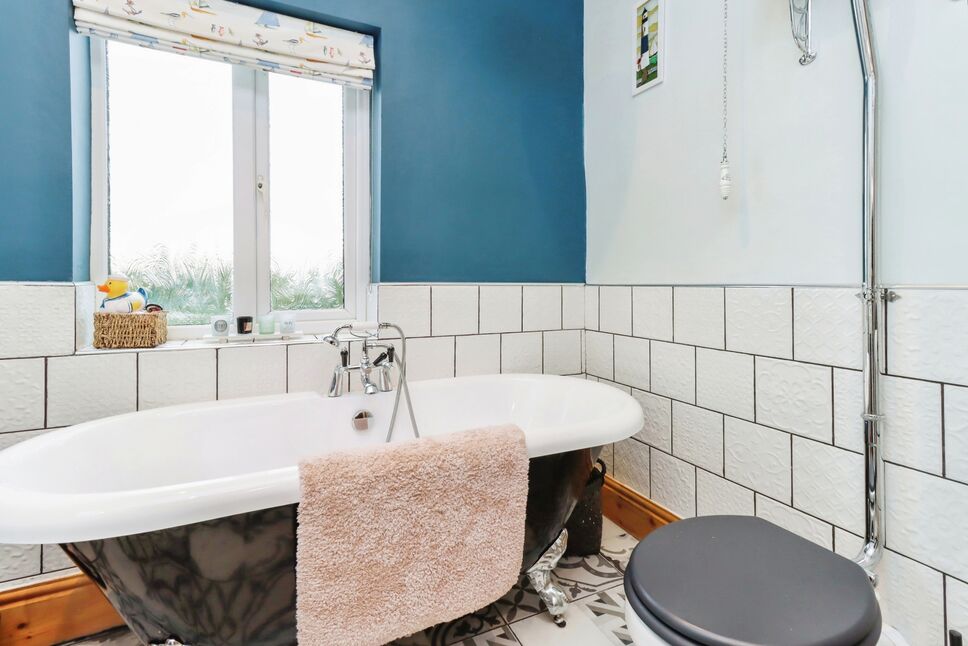 Refitted suite comprising WC, wash basin, contemporary roll top bath, shower cubicle, feature radiator, tiled floor, double glazed window.