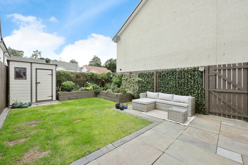 Externally, the home boasts a private rear garden with a paved patio area ideal for outdoor dining, leading to a lawn bordered with mature shrubs. The corner plot offers extra outdoor space and privacy compared to standard terrace homes.