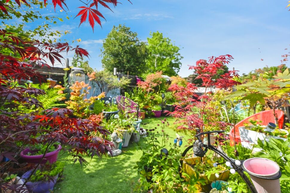 Stunning rear garden, being mainly laid to lawn with a path leading down the side and front path . Filled with colour having a large range of trees and shrubs which will be a delight to any keen gardener.