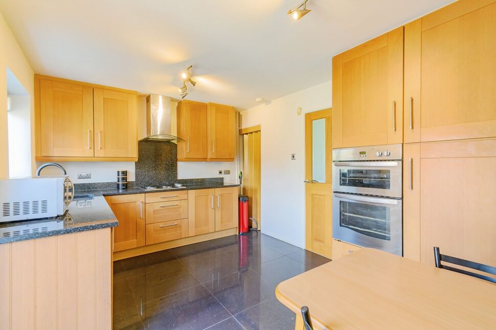 A modern range of wall and base units with a complementary work surface, integrated oven and hob, spaces for appliances, tiled flooring, radiator, under stairs storage, uPvc double glazed window and door to the rear elevation.