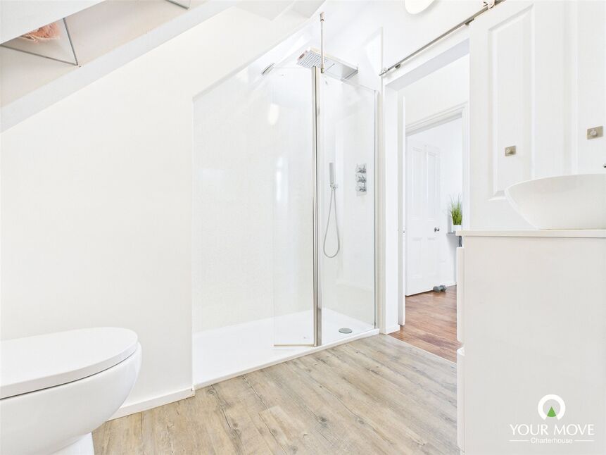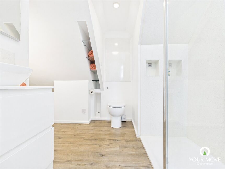 Walk in shower with rainfall shower and further shower head, counter top wash basin onto gloss white vanity unit with mirror, light and shaver point over, close coupled WC, under floor heating, eaves storage areas, space and plumbing for washing machine, Karndean flooring, extractor, built in storage, down lights, Velux double glazed window.